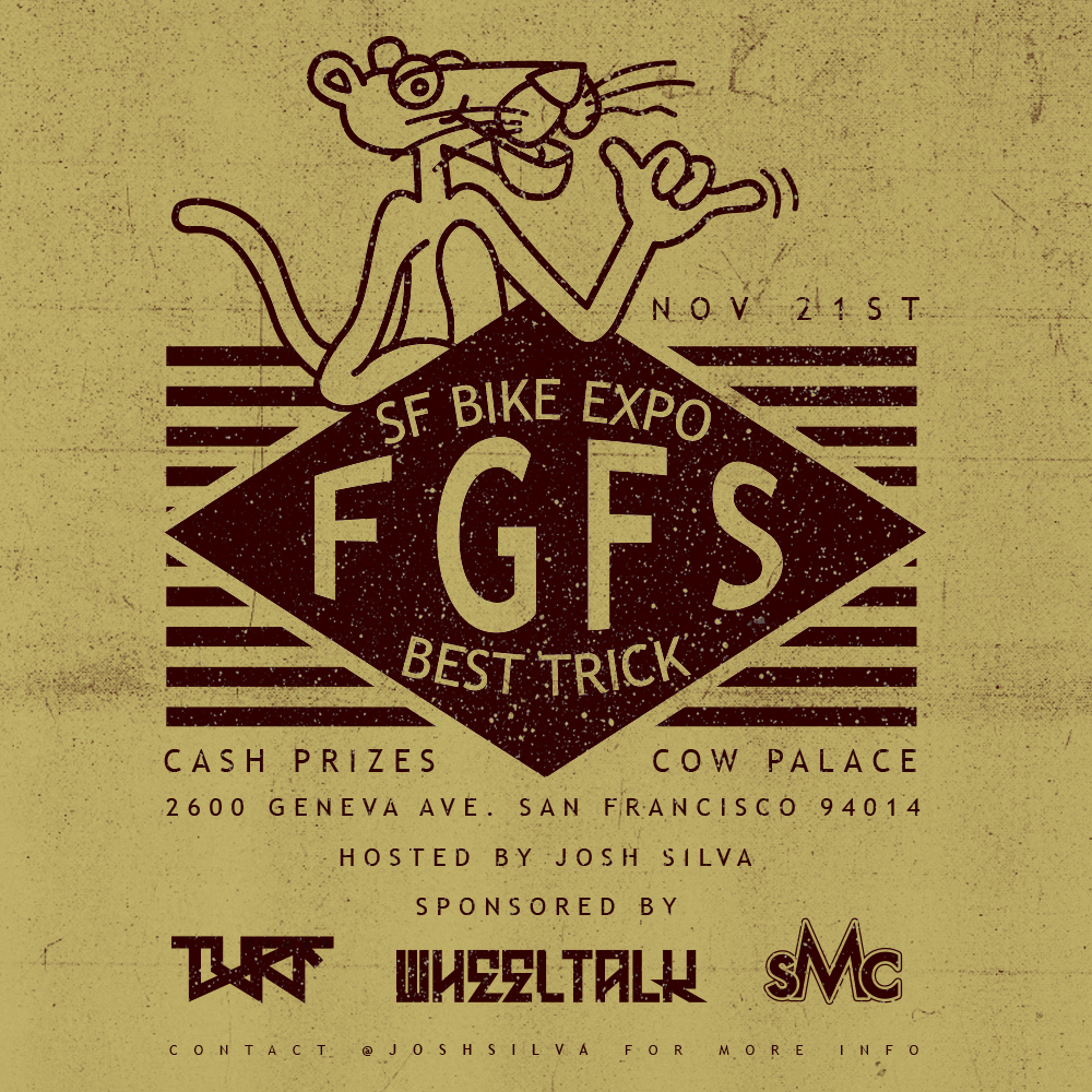 Cow Palace and Josh Silva teamed up for this best trick comp going down November 21st in San Francisco. It’s last minute, but you don’t wanna miss it. Cash and product prizes and a good ass time with a bunch of fellow FGFS riders. What more could you ask for? Doors open at 10am, be there no later than 12pm! Supported by Turf Bikes, Wheel Talk, and yours truly, SMC.